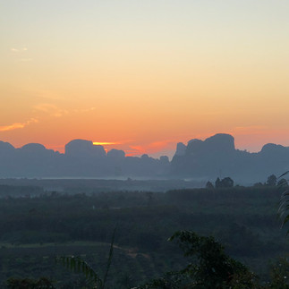 Boa Ey! Wir stehen heute schon um 5 Uhr auf. Es geht nochmal zum Din Daeng Doi, Sonnenaufgang schauen und diesmal hoffentlich mit Sonne! Wir werden gemeinsam mit einem Paar aus Wales das letzte Stück mit dem Pickup hochgefahren. Anfangs sind wir quasi alleine da. Wir machen alle Kameras startklar und besorgen noch Getränke, dann warten wir auf das Spektakel. Nur wenig später beginnt der spektakulärste Sonnenaufgang, den wir beide in unserem Leben gesehen haben. Ein tolles Farbenspiel und sich auflösender Morgendunst. Ein echtes Erlebnis, ruhig mit wenig Menschen. Zu Fuß und voller Eindrücke laufen wir wieder runter zum Roller. Wo wir nun so früh schonmal wach sind, fahren wir dann direkt weiter zu den Emerald Pools. Für die gut 70 Kilometer einWeg veranschlagt das Navi 1 Stunde und 20 Minuten. Also quasi, als wenn man von Mühlhausen nach Stuttgart fährt, allerdings auf zwei Rädern in T-Stirt und Shorts und mit ca. 60 km/h im Schnitt. Wir beißen uns durch, fahren durch Krabi und an zwei Universitäten vorbei. An den Pools angekommen zahlen wir für den Parkplatz 20 Baht und gehören zu den Ersten. Die Emerald Pools sind quasi ein Naturpark mit drei Seen. Das Gebiet ist ähnlich wie ein Moor im Dschungel, wo sich ein Bach durchschlängelt und sich drei Naturbecken bilden. Man läuft einen betonierten Dschungelpfad ca. 1 km lang und kommt zum ersten Becken, dem Crystal-Pool. Hier spiegelt der komplette See sein Umland. Nach weiteren 400 Meter erreichen wir das Hauptbecken - den Emerald Pool. Das Becken wird durch kristallklares Wasser gespeist, das angenehm warm ist und hier kann man gemeinsam mit ein paar Fischen, ein Bad nehmen. Man kann eigentlich keinen Unterschied zwischen ober und unter der Wasseroberfläche erkennen, so klar ist das Wasser. Wahnsinn. Wir genießen ein kleines Bad, machen uns wieder trocken und laufen nochmals ca. 600 Meter weiter durch den Dschungel. Diesmal auch auf unbefestigten Pfaden und sehen sogar einen Varan. Dann kommen wir am "Blue Pool" an. Der 3-5 Meter tiefe kleine See (Umfang 10 Meter) schimmert bläulich und in der Mitte steigen kleine Luftblasen auf. Ein tolles Naturschauspiel. Und das Beste an allem: wir sind so rechtzeitig dran, dass überall kaum Leute sind. Auf dem Rückweg begegnen uns dann einige Reisegruppen und am Parkplatz bekommt man dann einen Eindruck, was noch los sein wird. Zurück im Hotel wird gechillt, dann gehen wir Wäsche waschen lassen und gönnen uns in der "Shutterbox" ein Kaltgetränk am Nachmittag. Leider geht das Experiment nicht auf. Wir haben zwei Getränke bestellt die es eigentlich als Hot gibt und wollten die als Frappé. Geschmacklich ist es nicht der Hit! Dann gehts weiter zum Nachtmarkt. Fleischspieße und Reis mit Gemüse! Als wir hinkommen, sehen wir verkleidete Menschen und eine Jugend-Marching-Band und stellen fest, dass die Kinderwelt des Nachtmarkts heute offziell eröffnet wird. Leider wußte keiner was zuvor. Also auch gestern war hier kein Plakat oder so und darum hat die kleine Parade auch quasi keine Zuschauer, wird aber eisern von zwei Leuten moderiert. Wir schnappen am Strand noch ein Getränk, gehen die Wäsche holen und dann wars das für heute. Morgen, also Heiligabend, wollen wir früh nach Railay-Beach mit einem Longtail-Boot (Holzboot mit aufgesetztem Dieselmotor) und am Abend haben wir in einer super Beach-Bar einen Tisch reserviert. Dann steht schon wieder ein Ortswechsel nach Phuket an, für den wir am 25.12. ein Grab-Taxi auf 11 Uhr bestellt haben.