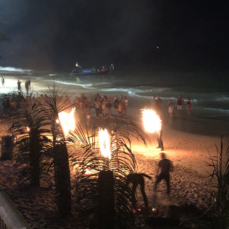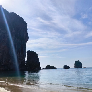 So, das war also unser Heiligabend in Thailand. Wir waren wieder wie die frühen Vögel unterwegs und standen um 8.30 Uhr am Schalter, um zwei Tickets für die Überfahrt mit dem Longtailboot nach Railay-Beach zu besorgen. Für 400 Baht bekommen wir Hin- und Rückfahrttickets, warten kurz und werden dann einem Boot zugeteilt. Der Einstieg ist am Strand nicht ganz so einfach. Backbord hängt eine Drei-Stufen-Leiter über Bord. Man steigt aus dem Wasser raus ein. Sowohl beim Einsteigen, wie auch beim Aussteigen stürzen hier Leute auf dem Boot, da das feuchte Holz sehr rutschig ist. Daher wohl die vielen Kliniken hier in Ao Nang?! Die Überfahrt dauert gut 10 Minuten und führt an coolen Felsformationen vorbei zum großen Weststrand der Halbinsel. Es ist noch nix los. Voll gut. Wir schlendern durch die Gegend und stellen fest, hier ist Infrastruktur wie auf dem Festland. Also Hotels, Bars, Mini-Märkte und so weiter. Nur wenigr in Summe. Am Oststrand folgt dann ein langer Steg, wo Ausflugsboote anlegen und mit Traktor und Anhänger die Gäste vom Wasser samt Gepäck an Land gebracht werden. Schon lustig, wenn im Meer ein Traktor mit Anhänger bei einem Boot parkt und aufläd. Wir gönnen uns ein Käffchen und suchen einen Ausblickpunkt. Wir müssen feststellen, den erreicht man nur durch Klettern mit festem Schuhwerk. Wir haben Flipflops und laufen daher ein wenig in den Dschungel hinein. Man läuft hier an Felsen entlang die aussehen, als hätte man einen Querschnitt durch eine Tropfsteinhöhle gemacht. Achja, Affen hat es hier auch. Wir nutzen noch die Gelegenheit für Fotos mit Weihnachtsmütze und fahren dann wieder zurück. Die Halbinsel ist nun gut gefüllt. Der Ausstieg vom Boot dann zurück in Ao Nang bringt nasse Klamotten mit sich. Es hat ordentlich Wellengang und so werden wir beide klatsch nass und fahren erstmal ins Hotel zum "trocken legen". Da wir eh nass sind, kühlen wir zuvor noch im Pool ab. Dann gehts wieder ins Getümmel, da wir noch kein Frühstück hatten. Im "Tan" gibts Egg Benedict und Omlette Avocado. Wir düsen raus zum Starbucks im Resort, wo wir seiner Zeit schon mal waren, haben aber keine Lust auf noch nen Kaffe. Also drehen wir um und halten an einer lässigen Strandbar auf ne Kokosnuss und ne Coke. Auf dem Weg zurück liegt das Elefantenresort, bei dem ich mal war zum Baden usw. mit den Elefanten. Wir können spontan Elefanten füttern. Schon cool, die riesen Tiere! Dann zurück ins Hotel, chillen und dann schick machen für Heiligabend im Club. Wir haben einen Tisch mit Mindestverzehr 3000 Baht reserviert. Wir sitzen ganz gut, das Essen ist ok. Der Service geht so. Wir können mal wieder nicht zeitgleich essen. Dann folgt die erste Feuershow, die richtig cool ist und mit der Ankunft des Weihnachtsmann per Boot am Club endet. Dieser verteilt Süßies, auch an Petra. Wir kommen noch ins Gespräch mit einer Familie aus Deutschland und schauen uns dann die zweite Feuershow an. Die angepriesene Live-Musik gibt es leider nicht und der DJ legt Disko-Mukke auf, die nicht so recht zum Rest passen will. In jedem Fall war es ein cooler und spezieller Tag - auch mit ein wenig Wehmut, ihn und auch die Folgenden ohne Familie und Freunde zu verbringen.